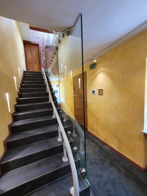 Das Glasgeländer musste der Stiege und dem Deckenverlauf angepasst werden sowie im 1. OG eine freitragende Absturzsicherung herstellen.